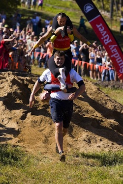 A writer and his wife participate in a centuries-old Scandinavian tradition known as “Wife-Carrying,” a sport where male competitors carry a female teammate while racing through an obstacle course: